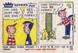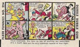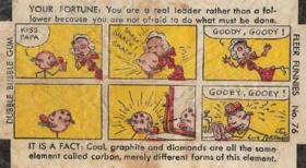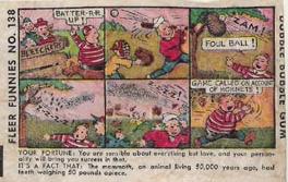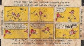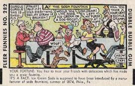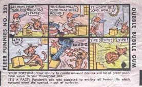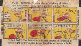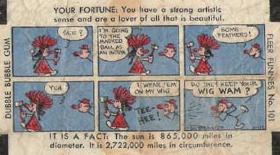 The early comics were especially large and colorful. They included Fleer Fortunes and Dubble Bubble Facts. They were also sequentially numbered which makes collecting them easy. They are not dated though, so it's difficult to know the exact year of release. By the late 1950s, early 1960s, Fleer Funnies shrank to the small size most people remember. Last time I looked, you could still find comics with the gum. Pud has been slightly redesigned and the comics are printed blue ink on white instead of full color. More than 1,002 comics have been released over the years. Collect them all! |